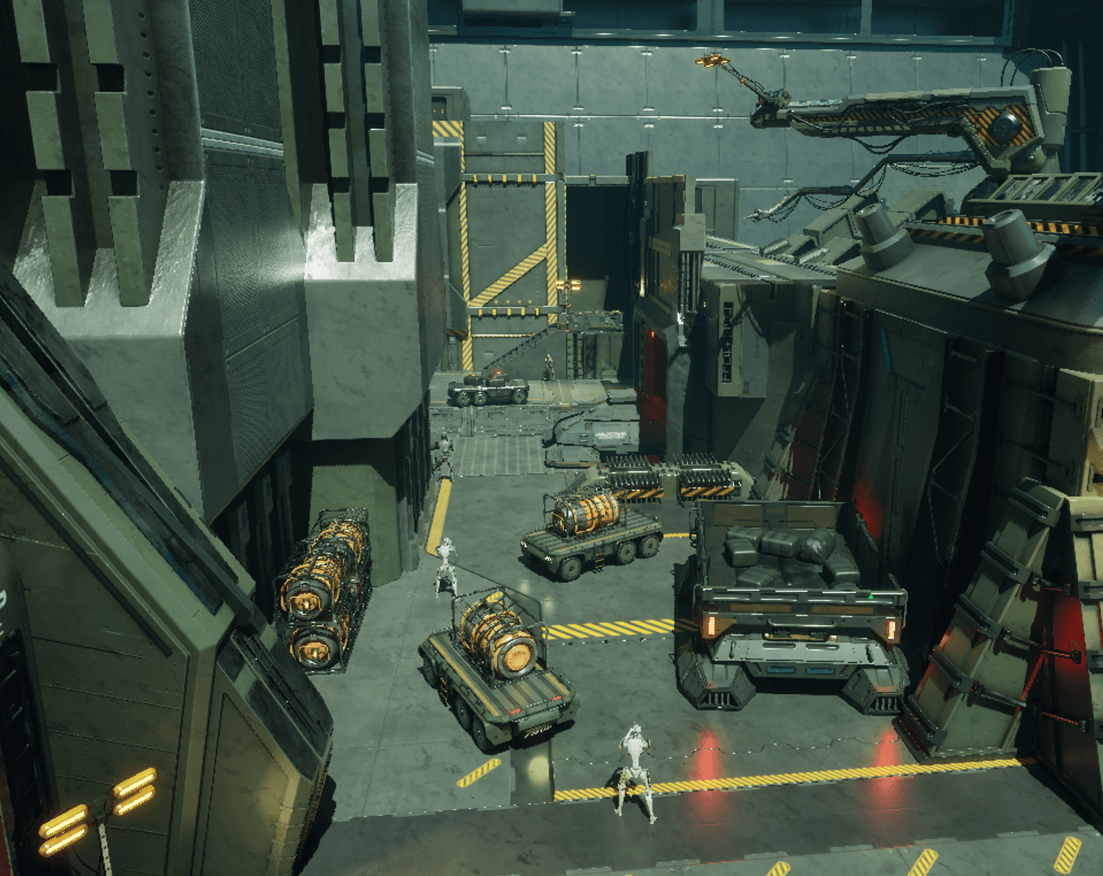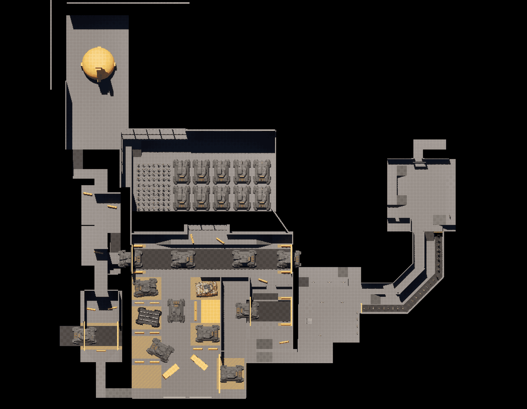 I wanted to design a level with sci-fi industrial underground themes. From early prototyping I had ideas for several rooms, robotics bays, reactor room and tank production line. I was able to rapidly create a testable blockout. I used the persistent level layer system in unreal to have these blockout level as I slowly replaced them with proper assets.